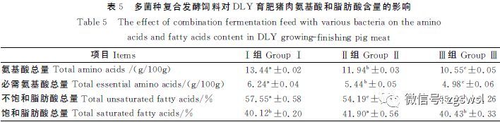對3組DLY育肥豬肉樣品中的氨基酸和脂肪酸含量進行檢測結果見表5。從表5知,3組豬肉樣品中:氨基酸總量,Ⅰ組,Ⅲ組,Ⅰ組與Ⅱ組和Ⅲ組相比差異顯著(P<0.05),Ⅱ組與Ⅲ組相比差異顯著(P<0.05),Ⅰ組分別比Ⅱ組和Ⅲ組高12.6%、27.4%。必需氨基酸總量,Ⅰ組,Ⅲ組,Ⅰ組與Ⅱ組和Ⅲ組相比差異顯著(P<0.05),Ⅱ組與Ⅲ組相比差異顯著(P<0.05),Ⅰ組分別比Ⅱ組和Ⅲ組高14.7%、25.3%。不飽和脂肪酸總量,Ⅰ組,Ⅱ組,Ⅰ組與Ⅲ組和Ⅱ組相比差異顯著(P<0.05),Ⅲ組與Ⅱ組相比差異顯著(P<0.05),Ⅰ組分別比Ⅱ組和Ⅲ組高6.2%、4.2%。飽和脂肪酸含量,Ⅱ組,Ⅰ組,Ⅱ組與Ⅰ組和Ⅲ組相比差異顯著(P<0.05),Ⅰ組與Ⅲ組相比差異不顯著(P>0.05),Ⅰ組分別比Ⅱ組和Ⅲ組低4.3%、0.8%。