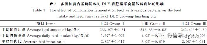 3組DLY育肥豬的采食量和料肉比結果見表3。從表3知,平均飼料用量和平均日采食量,Ⅱ組,Ⅰ組小,Ⅱ組與Ⅰ組和Ⅲ組相比差異顯著(P<0.05),Ⅰ組與Ⅲ組相比差異顯著(P<0.05)。平均料肉比,Ⅰ組小,分別比Ⅱ組和Ⅲ組低8.7%、8.4%;Ⅱ組和Ⅲ組表現(xiàn)差異不顯著(P>0.05),與Ⅰ組相比差異顯著(P<0.05)??梢?,與Ⅱ、Ⅲ組相比,多菌種復合發(fā)酵飼料組的平均日采食量少且平均料肉比小。