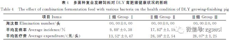3組DLY育肥豬的發(fā)病率和醫(yī)療費用結果見表4。從表4可知,試驗中各組豬均沒有死亡淘汰,但發(fā)病率有所差別。平均發(fā)病率,Ⅲ組,Ⅰ組,Ⅲ組與Ⅱ組和Ⅰ組相比差異顯著(P<0.05),Ⅱ組與Ⅰ組相比差異顯著(P<0.05),Ⅰ組分別比Ⅱ組和Ⅲ組低44.6%、49.1%。平均醫(yī)療費用,Ⅲ組,Ⅰ組,Ⅲ組與Ⅱ組和Ⅰ組相比差異顯著(P<0.05),Ⅱ組與Ⅰ組相比差異顯著(P<0.05),Ⅰ組分別比Ⅱ組和Ⅲ組低48.7%、51.8%??梢?,與Ⅱ、Ⅲ組相比,多菌種復合發(fā)酵飼料飼喂的DLY育肥豬發(fā)病率小,平均每頭豬的醫(yī)療費用少。
